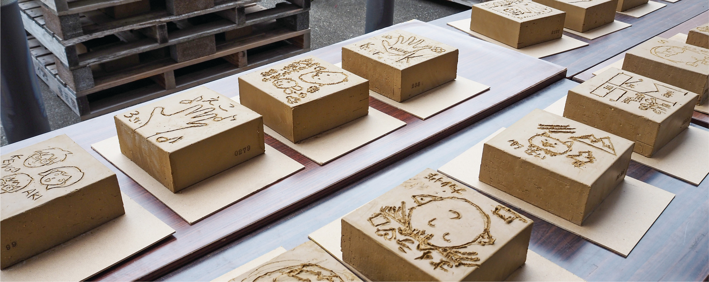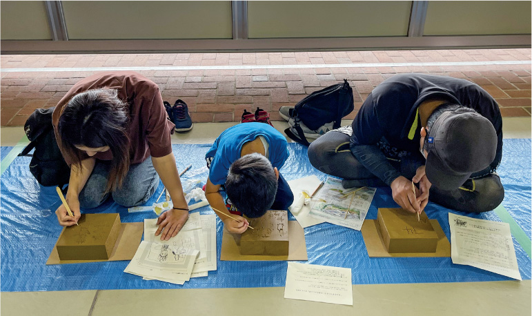 交換した粘土状態をその場(指定場所)で彫り込みを行っていただきます。テーマを決めるのか、参加者様の自由にするか彫り込む内容は事前に決定しておきます。