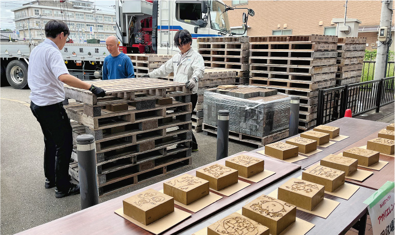 出来上がった作品を大切に扱いトラックに積み込みます。レンガ工場(窯)のある場所へ移動いたします。1000℃以上で焼成してレンガ作品に変わります。焼成後、レンガを指定場所まで運搬いたします。